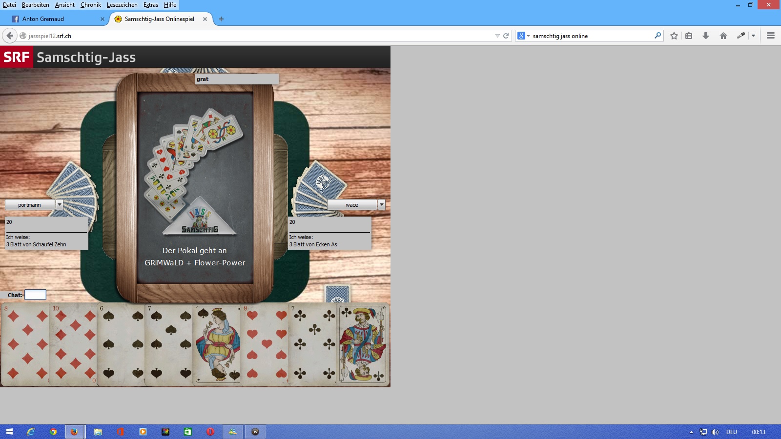 Freitag, den 02. Januar 2015 angefangen online zu Jassen und gleich Schieber ( 2500 Punkte ) gewonnen. Mein Nickname ist / war GRiMWaLD. Ich habe als 6 jähriger angefangen zu Jassen.