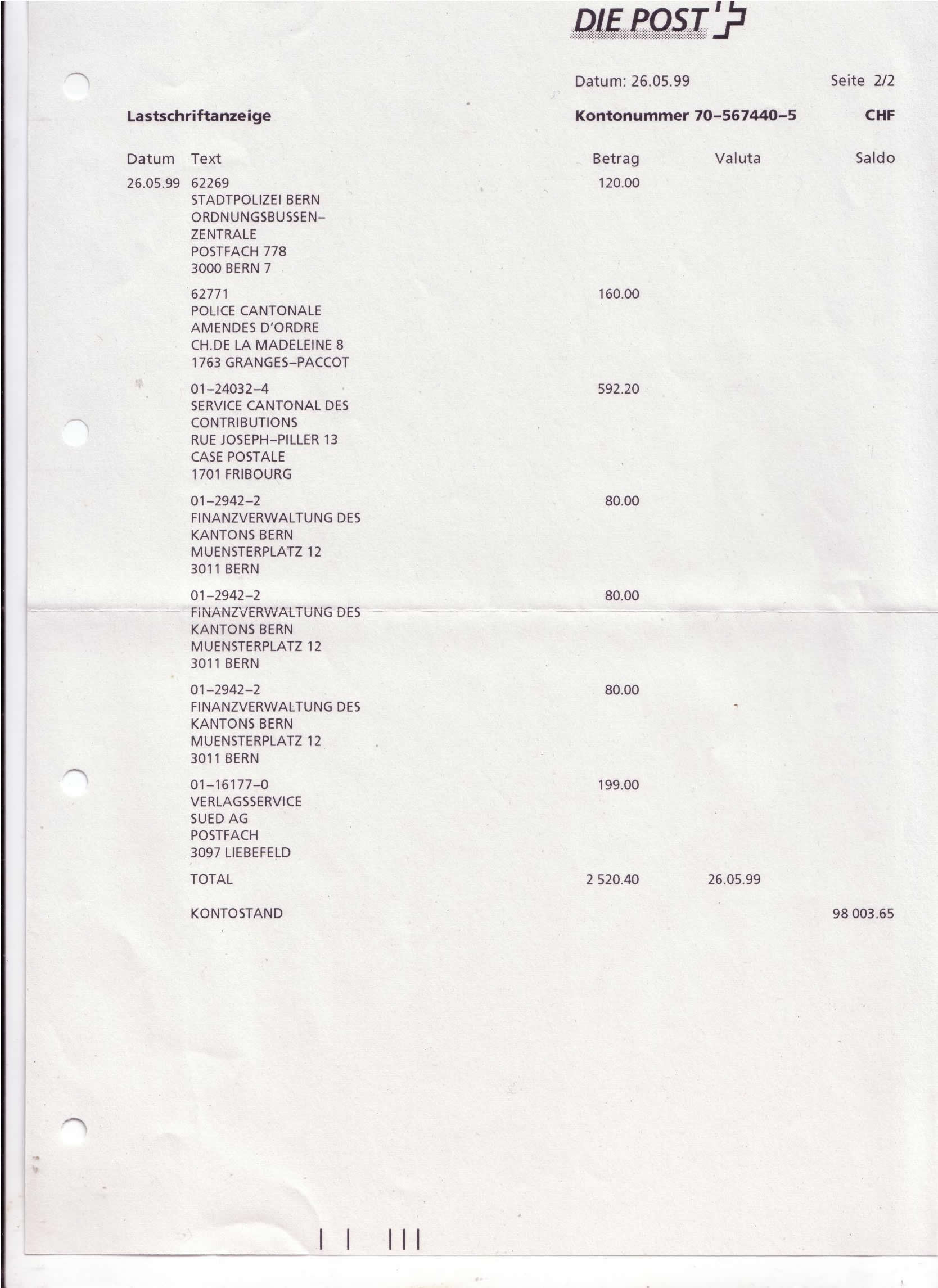 Kontoauszug vom Jahre 1999, Postchekkonto