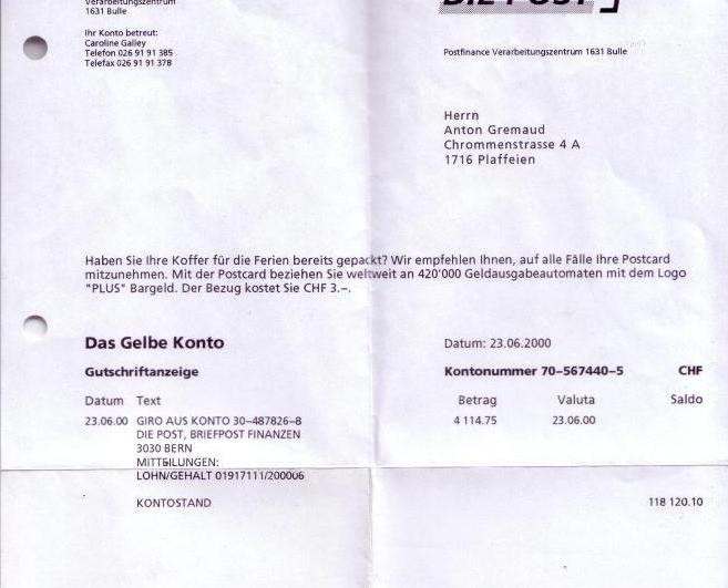 Kontoauszug vom Jahre 2000, Postchekkonto